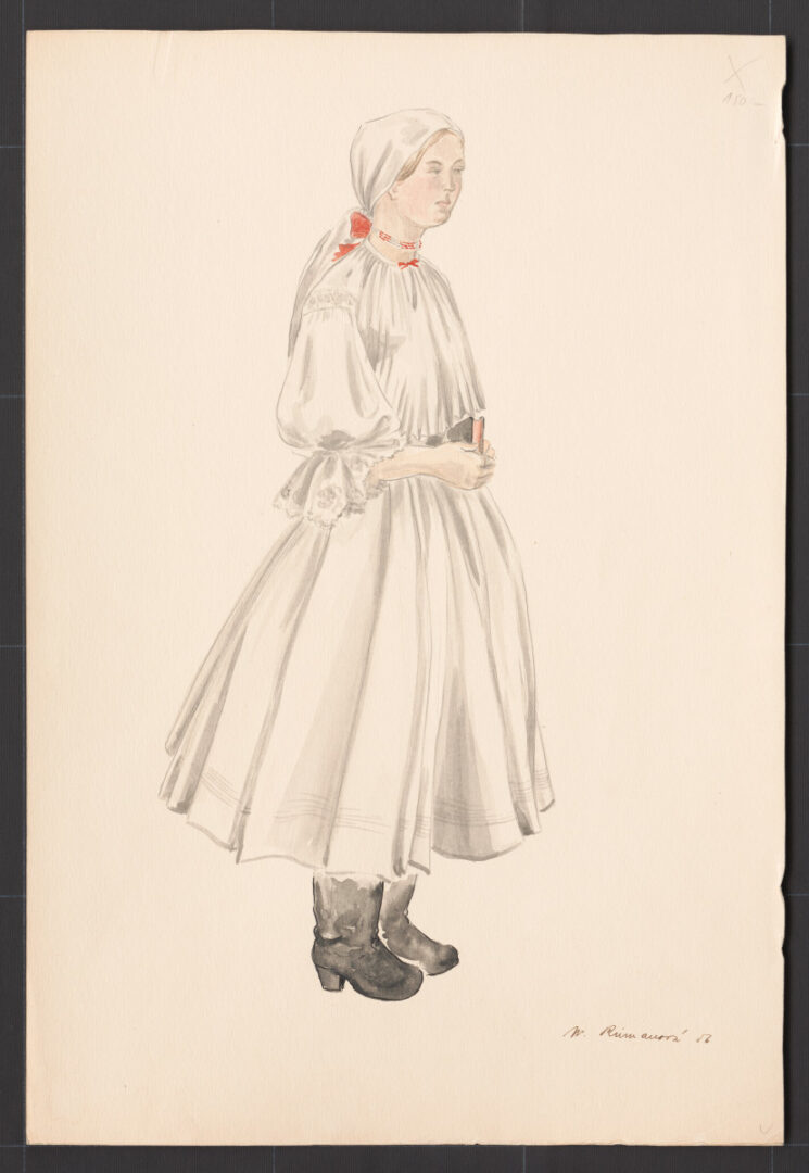 Sviatočný odev ženy v letnom období, Oščadnica, začiatok 20. storočia. Žena má oblečený rubáš, rukávce a sukňu (fortuch), všetko z domáceho ľanového plátna. Na sukni má opásanú zásteru (zopasku) z bieleho etamínu. Na hlave má na čepci uviazanú dlhú šatku (podvičku). Takto oblečené bývali vo sviatočné dni mladé ženy vo veku do tridsať rokov.