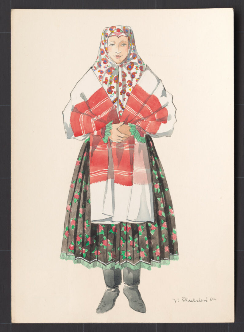Sviatočný odev staršej ženy, Osturňa, začiatok 20. storočia. Žena má oblečený plátenný rubáš (bendľacku), plátenné rukávce (kosuľu), sukňu so živôtikom (kanafasku) a čiernu širokú zásteru (fartuch) so vzorom veľkých kvetov. Na hlave má na čepci založenú polovlnenú šatku s potlačeným slimákovým vzorom. Cez plecia má prehodenú zloženú odevnú plachtu s červeno vytkanými koncami. Takto oblečené bývali začiatkom 20. storočia staršie ženy v chladných jarných alebo jesenných dňoch.