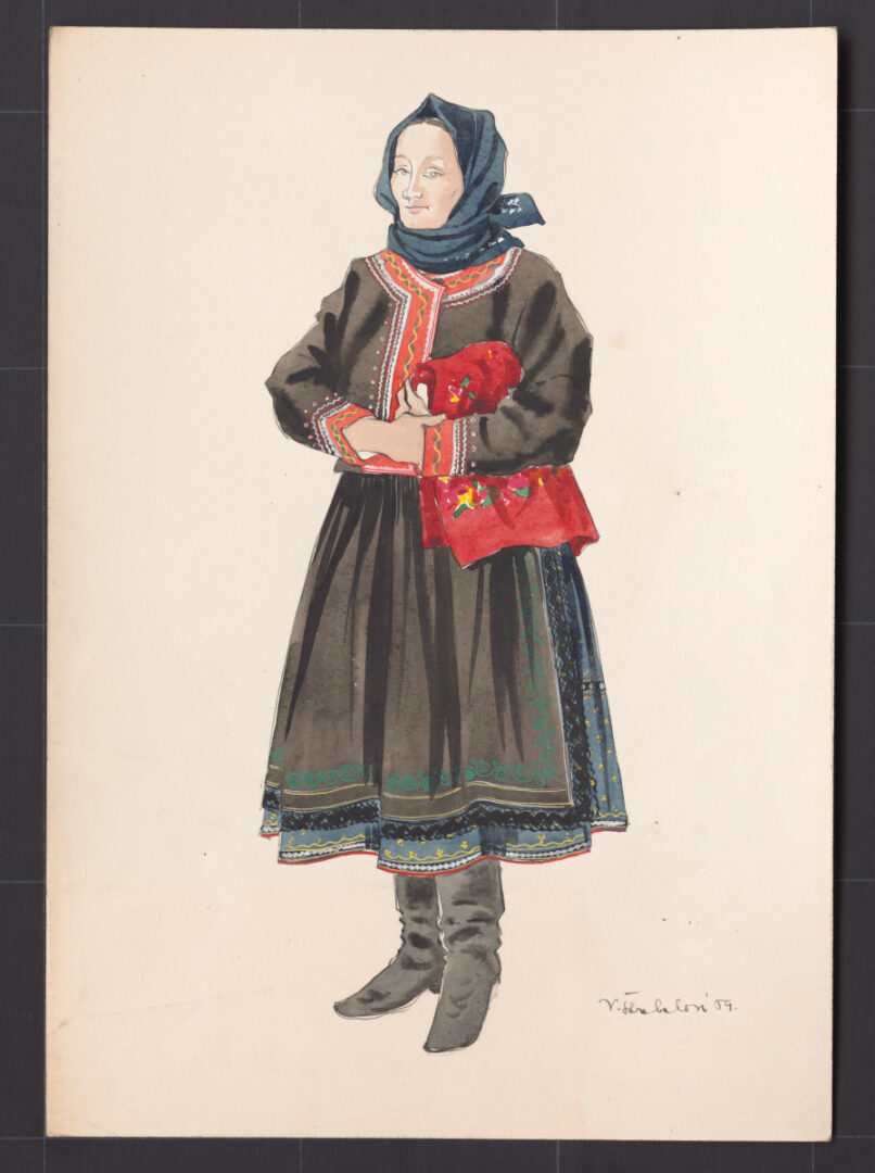 Sviatočný odev ženy v zimnom období, Poniky, prvá štvrtina 20. storočia. Žena má oblečený rubáš z konopného plátna, rukávce z bavlneného plátna, krátky brokátový živôtik, cez ktorý má uviazanú veľkú trojuholníkovú šatku (kosičku) – z nej vidno vzadu uviazané konce, modrotlačovú sukňu a širokú zásteru (šatu) z dvoch pôl tmavého glotu. Pred chladom ju chráni súkenná kabanica a na hlave uviazaná veľká modrotlačová šatka. Pod ľavou pazuchou drží červenú šatku, ktorá začiatkom 20. storočia nahradila pôvodnú pôlku.