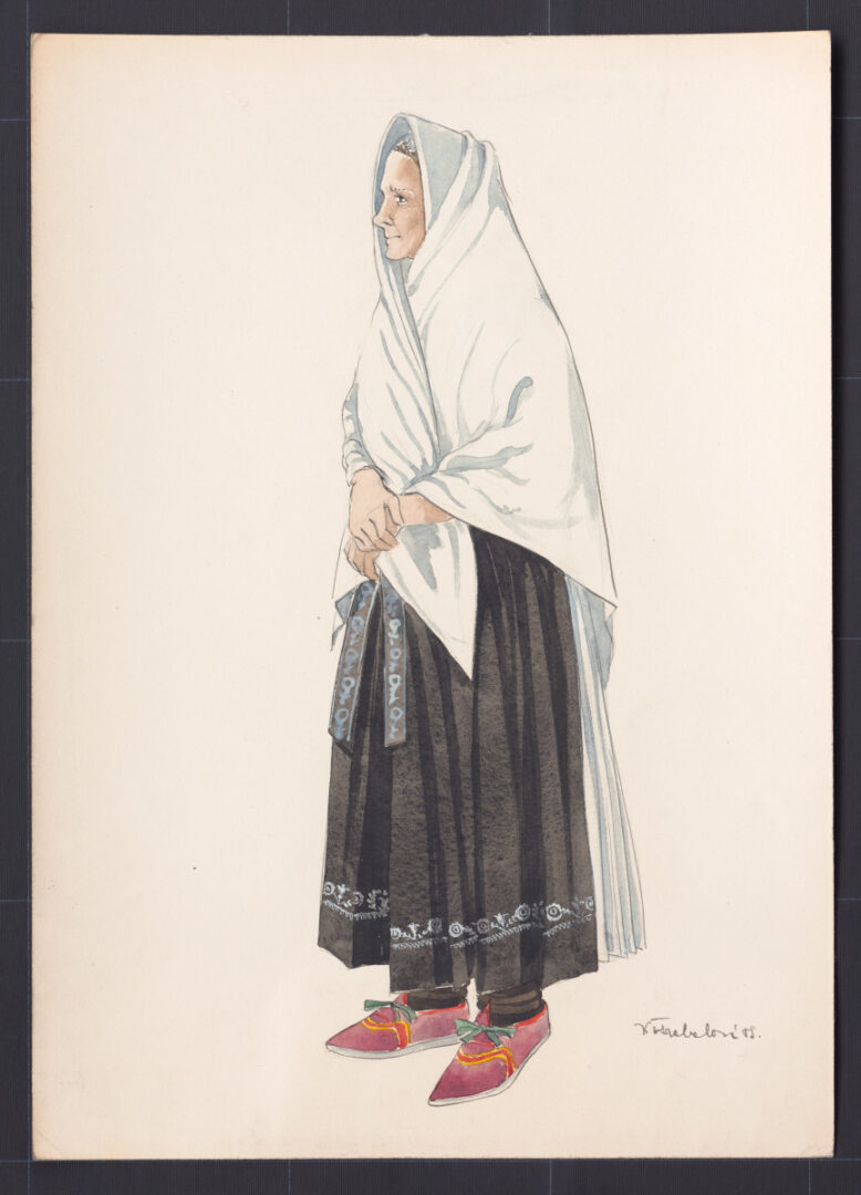 Sviatočný odev staršej ženy v chladnom období, Záriečie, prvá štvrtina 20. storočia. Žena má oblečený rubáš (spodník), rukávce, sukňu so živôtikom (rubáč) a zásteru (zápunku). Rubáš a rukávce sú z kupovaného bavlneného plátna, sukňa so živôtikom z hrubšieho domáceho ľanového plátna a zástera z tmavého glotu. Na prelome 19. a 20. storočia biele ľanové plátno postupne nahradila modrotlač. Zmenil sa aj názov sukne, namiesto rubáč sa začalo používať označenie sukňa. Cez hlavu a plecia má žena prehodenú odevnú plachtu, ktorá sa nosila len v chladnom období. Na vek ženy poukazuje pás bielej výšivky na zástere. Biela výšivka bola charakteristická pre staršie ženy. Mladé ženy mali výšivku pestrofarebnú, bielo vyšívanú zásteru si opásali len v období smútku.