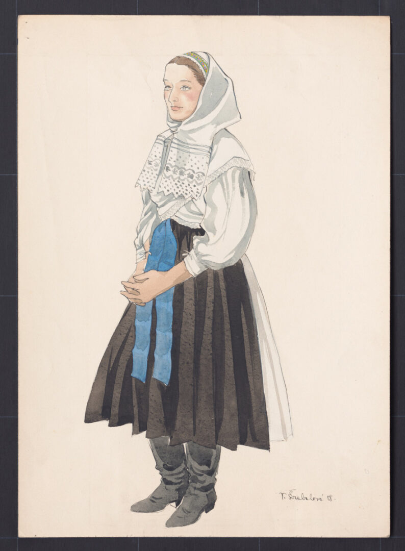 Sviatočný odev mladej ženy, Terchová, začiatok 20. storočia. Žena má oblečený rubáš, dvoje rukávcov, dvoje sukieň so živôtikom a širokú zásteru z dvoch pôl čierneho perkálu. Na pleciach a krížom cez hruď má uviazanú veľkú trojuholníkovú šatku (skosu). Na čepci má dlhú obdĺžnikovú šatku (podušku) z bieleho šifónu. Koncom 19. storočia mávali ženy takto upravenú hlavu vo sviatočné dni. Začiatkom 20. storočia sa dlhá šatka viazala už len pri čepčení mladej ženy počas svadobného obradu.