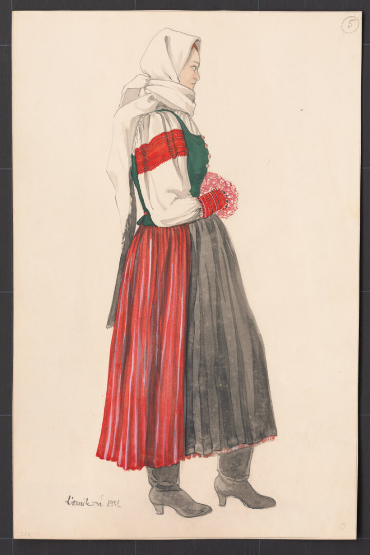 Sviatočný odev ženy. Pohľad zboku. Prvá štvrtina 20. storočia. Žena má oblečený rubáš (bendľacku), rukávce (oplečie), sukňu (kanafasku), čiernu širokú zásteru (fartuch) a zelený súkenný živôtik (lajbik). Na hlave má uviazanú veľkú plátennú šatku (pošivanu chustku). Takto oblečené bývali ženy vo sviatočné dni v lete. Sukňa je z domáceho červeno-bieleho kanafasu, ktorého znakom je pásikavý vzor. Druh opásanej sukne určoval charakter ďalších súčiastok odevu – zástery a živôtika. Ku kanafasovej sukni sa zásadne obliekal zelený súkenný živôtik a čierna široká zástera, ktorej jedinou ozdobou bol farebný spojovací švík.