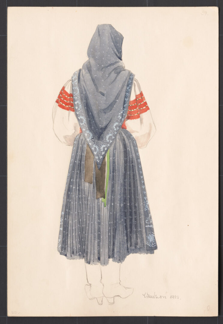 Sviatočný odev ženy. Pohľad zozadu. Prvá štvrtina 20. storočia. Žena má oblečený rubáš (bendľacku), rukávce (oplečie), sukňu z modrotlače (tlačenicu), bielu širokú zásteru (fartuch) a červený súkenný živôtik (lajbik). Široká zástera je ušitá z priesvitnej záclonoviny. Tvorila súčasť sviatočného odevu. Mohla sa opásať buď k modrotlačovej sukni, ako v tomto prípade, alebo k červenej súkennej sukni. Modrotlačová sukňa sa nosila najmä v nedeľu, súkenná zasa vo veľké sviatky alebo na sobáš. Sviatočný odev dopĺňa veľká modrotlačová šatka uviazaná pod šiju. Takto oblečené bývali ženy vo sviatočné dni v lete. Pri návšteve kostola by mali ešte cez plecia prehodenú pôlku (riantuch).