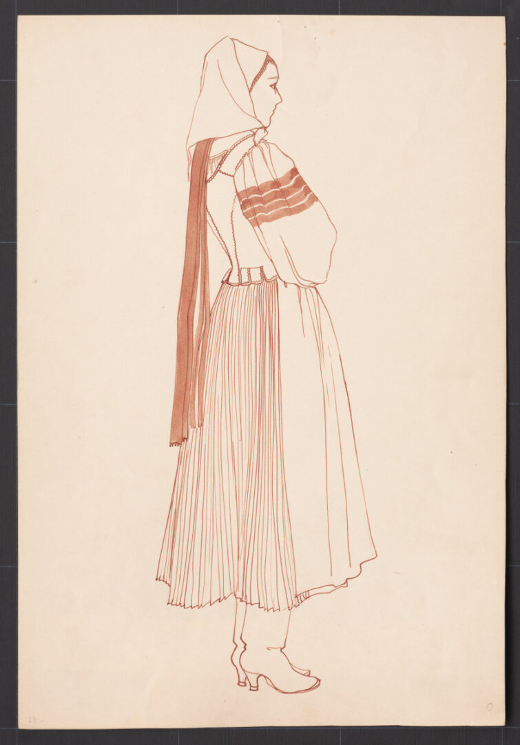 Kresba sviatočného ženského odevu z 1.polovice 20.storočia.