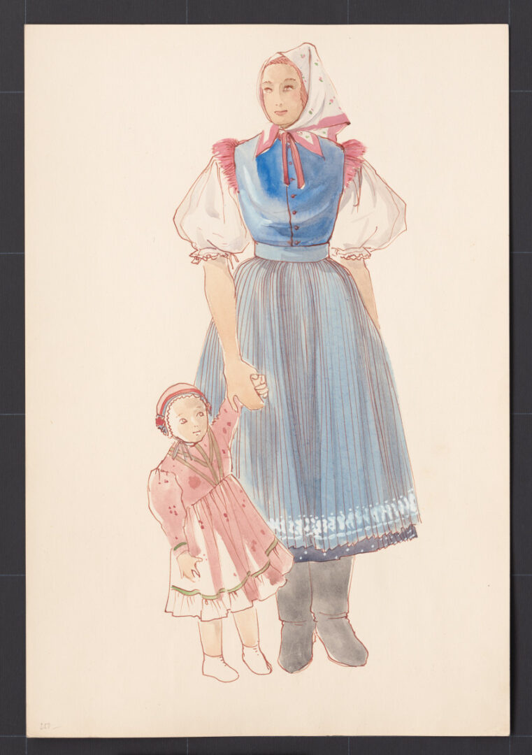 Sviatočný odev ženy z 1.polovice 20.storočia. Na košeli má žena oplecko, živôtik z plyšu, sukňu a zásteru z modrotlače. Pod živôtikom má plátennú šatku s našitými strapcami z vlny.