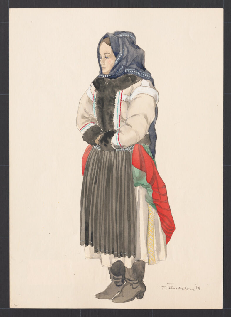 Vrchný odev ženy v zimnom období, Turie Pole, začiatok 20. storočia. Žena má na základnom odeve, ktorý pozostáva z rubáša, z rukávcov, zo súkenného živôtika, zo zelenej súkennej sukne a z čiernej širokej zástery z glotu, oblečený kožuch s rukávmi. Na hlave má uviazanú veľkú modrotlačovú šatku. Vykasať si prednú polu sukne bolo zvykom tak v lete, ako aj v zime. Len pri návšteve kostola sa sukňa nevykasávala. Lemovanie kožucha čiernou barančinou dokladá, že ide o oblečenie na sviatočný deň. Vo všedné dni sa nosili kožuchy bez tohto lenovania a bez výzdoby.