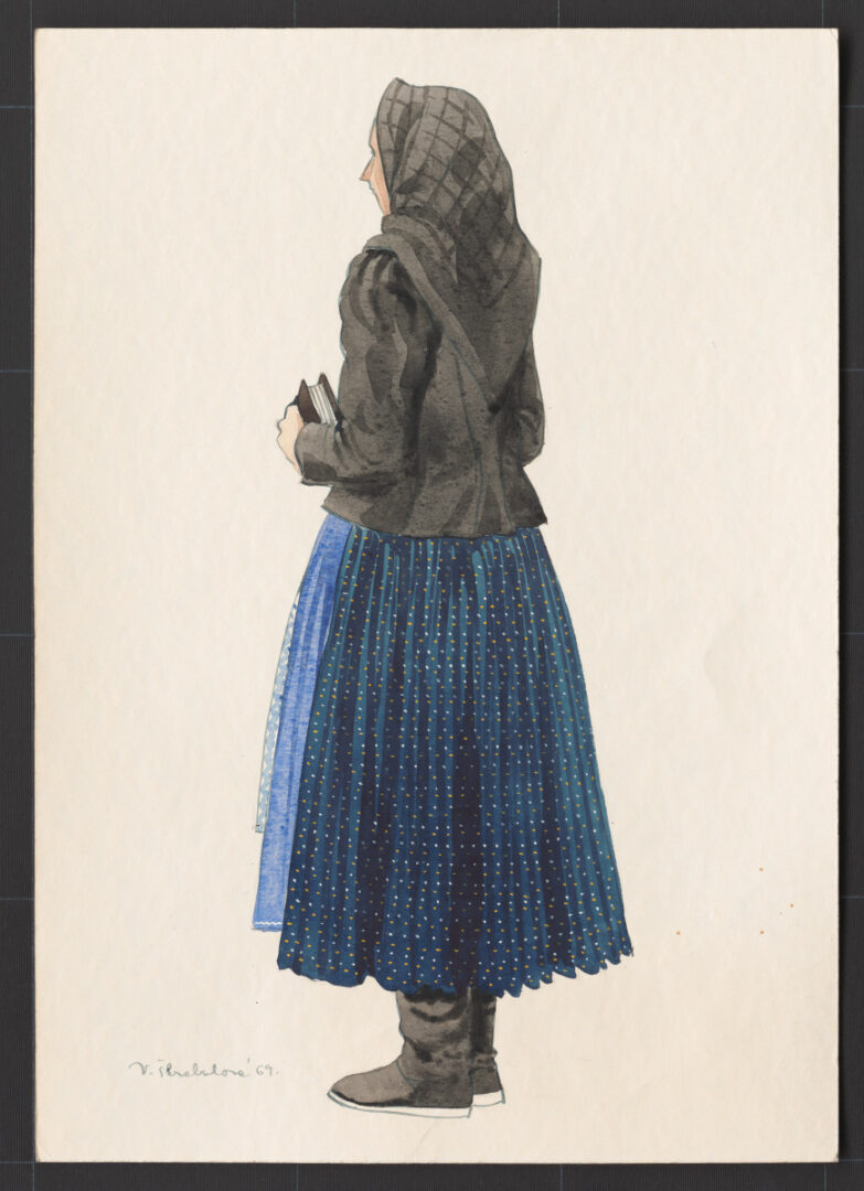 Sviatočný odev staršej ženy v chladnom období, Kubrá, druhá štvrtina 20. storočia. Žena má na základnom odeve, ktorý pozostáva z rukávcov, zo sukne so živôtikom a zo širokej zástery, oblečený kabátik (kacabaju) z čierneho glotu. Pod kabátik sa obliekali staršie, obnosené rukávce. O veku ženy hovorí čierna farba teplej šatky na hlave, čierny kabátik a modrá zástera bez výšivky. Takto oblečené chodili staršie ženy v chladné dni v nedeľu do kostola.