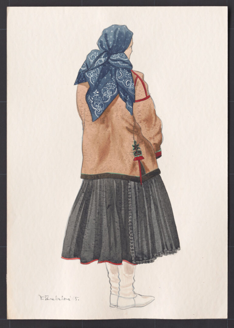 Sviatočný odev ženy v zimnom období, Horná Súča, začiatok 20. storočia. Pohľad zozadu. Žena má oblečené rukávce, čiernu súkennú sukňu, širokú zásteru z dvoch pôl tmavého farbiarskeho plátna a kožuch s rukávmi. Na hlave má uviazanú veľkú šatku z jemnej modrotlače. Obuté má biele pletené vlnené papuče. Súkenná sukňa sa obliekala výnimočne, iba na veľké sviatky. Veľké modrotlačové šatky bývali obojstranne vzorované, na každej strane s iným bielym vzorom, len bordúra bola rovnaká.
