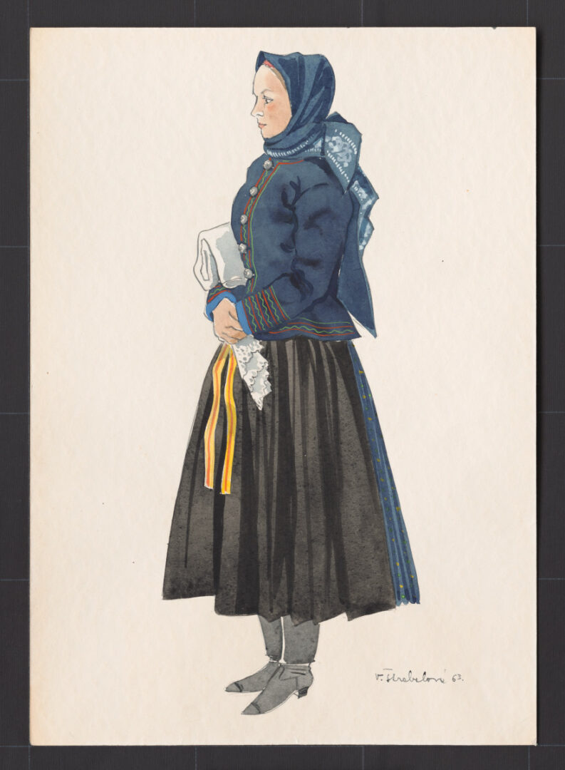 Sviatočný odev ženy v zimnom období, Jalovec, začiatok 20. storočia. Pohľad zboku. Žena má na sviatočnom odeve, z ktorého vidno len modrotlačovú sukňu a širokú čiernu perkálovú zásteru, oblečený dlhší kabátik, kanderku. Kabátik je ušitý z jemného továrenského súkna tmavomodrej farby, podšitý je barchetom a vatelínom. Na hlave má žena dozadu uviazanú veľkú modrotlačovú šatku s bielym vzorom. Pod pravou pazuchou drží zloženú odevnú plachtu (obrus), do ktorej sa ženy zahaľovali v prípade chladu alebo dažďa. Plachta sa nosila v lete i v zime.