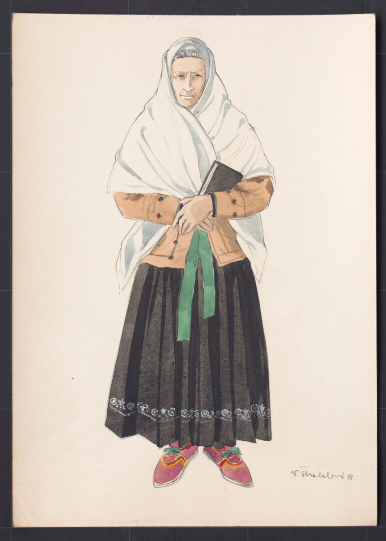 Sviatočný odev staršej ženy v zimnom období, Záriečie, prvá štvrtina 20. storočia. Žena má na základnom odeve, ktorý pozostáva z rubáša (spodníka), z rukávcov, zo sukne so živôtikom a zo zástery (zápunky), oblečený hnedý kožuch. Cez hlavu a plecia má prehodenú odevnú plachtu z damašku (obrus). Vo všedné dni nosili ženy odevnú plachtu z obyčajného plátna. Na vek ženy poukazuje pás bielej výšivky na zástere. Biela výšivka bola charakteristická pre staršie ženy. Mladé ženy mali výšivku na zástere pestrofarebnú, bielo vyšívanú zásteru si opásali len v období smútku.