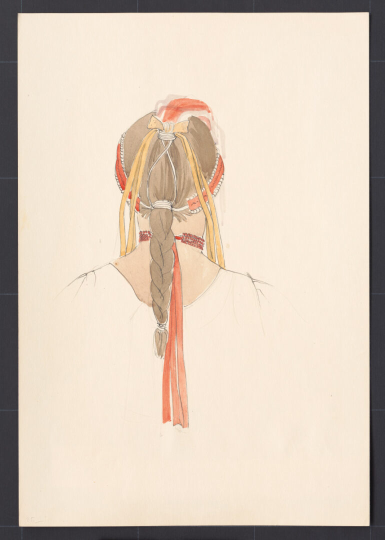Účes slobodného diavčaťa pod partu. Prvá štvrtina 20. storočia. Základom účesu bol jeden vrkoč upletený z vlasov vyviazaných vysoko na temene hlavy. Vrkoč slúžil na upevnenie venčeka z flitrov a súboru farebných stužiek, ktoré dopĺňali čelenku party.
