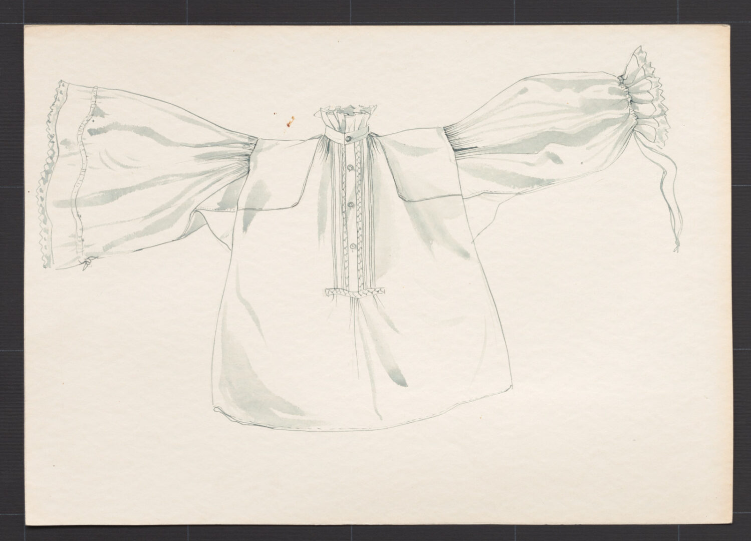 Rukávce, Veľký Blh, koniec 19. storočia. Rukávce sú ušité z jemného kupovaného bavlneného plátna. Majú rovný strih s kolmo prišitými širokými rukávmi, s nízkym stojatým golierikom a so zapínaním na rad drobných sklenených gombičiek. Golierik zdobí stojatý plátenný volánik a pozdĺž zapínania je niekoľko úzkych zámikov. Rukávce tvorili súčasť sviatočného odevu.