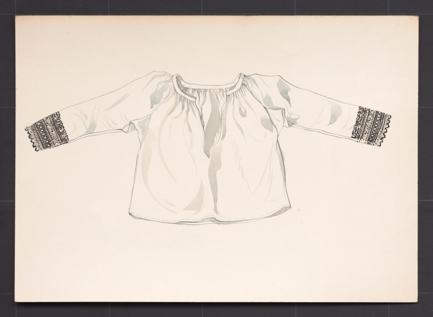 Rukávce, Veľké Zálužie, začiatok 20. storočia. Rukávce (košeľa) sú ušité z domáceho bavlneného plátna. Majú rovný strih s bokom prišitými rukávmi. Horný okraj predného i zadného dielu spolu s horným okrajom rukávov sú naberané a všité do hrubšieho obalka. Rukávy sú rovné a úzke, siahajú po zápästia. Čierna výšivka na koncoch rukávov dokladá, že rukávce boli určené na obdobie smútku alebo pôstu. Lokálny názov vychádza z toho, že rukávce sa šili z domáceho bavlneného plátna. Keby boli z tenkého kupovaného šifónu, nazývali by sa rukávce.