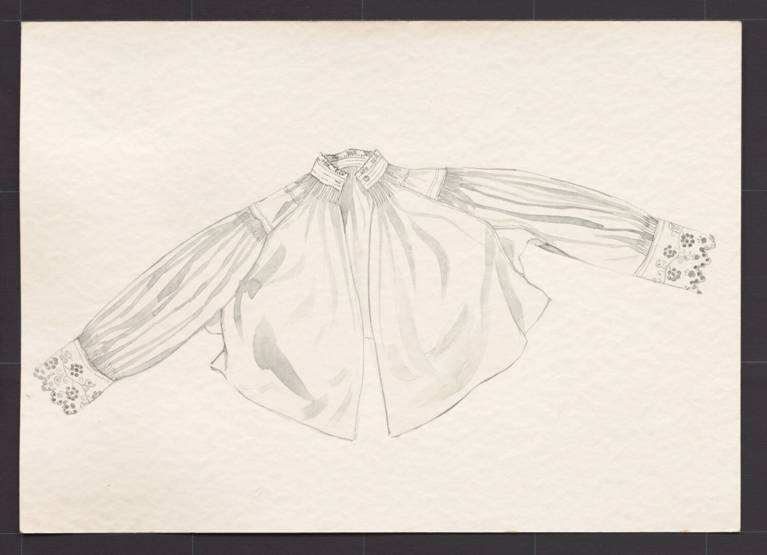 Rukávce, Studienka, prvá štvrtina 20. storočia. Rukávce (lémečkové rukávce) sú ušité z jemnejšieho kupovaného bavlneného plátna. Majú rovný strih s prieramkovými, bokom prišitými rukávmi a s nízkym stojatým golierom. Konce rukávov sú všité do manžiet (lémečkov). Golier a manžety zdobí jednoduchá biela výšivka, ktorú neskôr nahradila strojová výšivka. Lémečkové rukávce boli súčasťou všedného odevu.