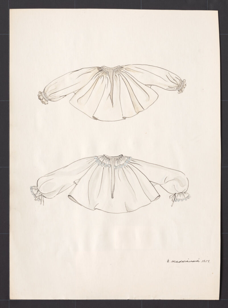 Rukávce, Turá Lúka, prvá štvrtina 20. storočia. a) Staršie rukávce na všedné dni. Ušité sú z konopného plátna. Nosili sa najmä koncom 19. storočia. Začiatkom 20. storočia si ich obliekali už len staršie ženy. b) Novšie rukávce na všedné dni. Ušité sú z jemného balneného plátna – šifónu. Začali sa nosiť koncom 19. storočia spočiatku ako sviatočné. Začiatkom 20. storočia sa sviatočnými rukávcami stali rukávce z tenkého batistu alebo mulu. Rukávce zo šifónu sa odvtedy nosili už len vo všedné dni. Oba druhy rukávcov majú spoločný strih. Rozdiely sú len v tom, že staršie nemajú okolo goliera a koncov rukávov našitú čipku.
