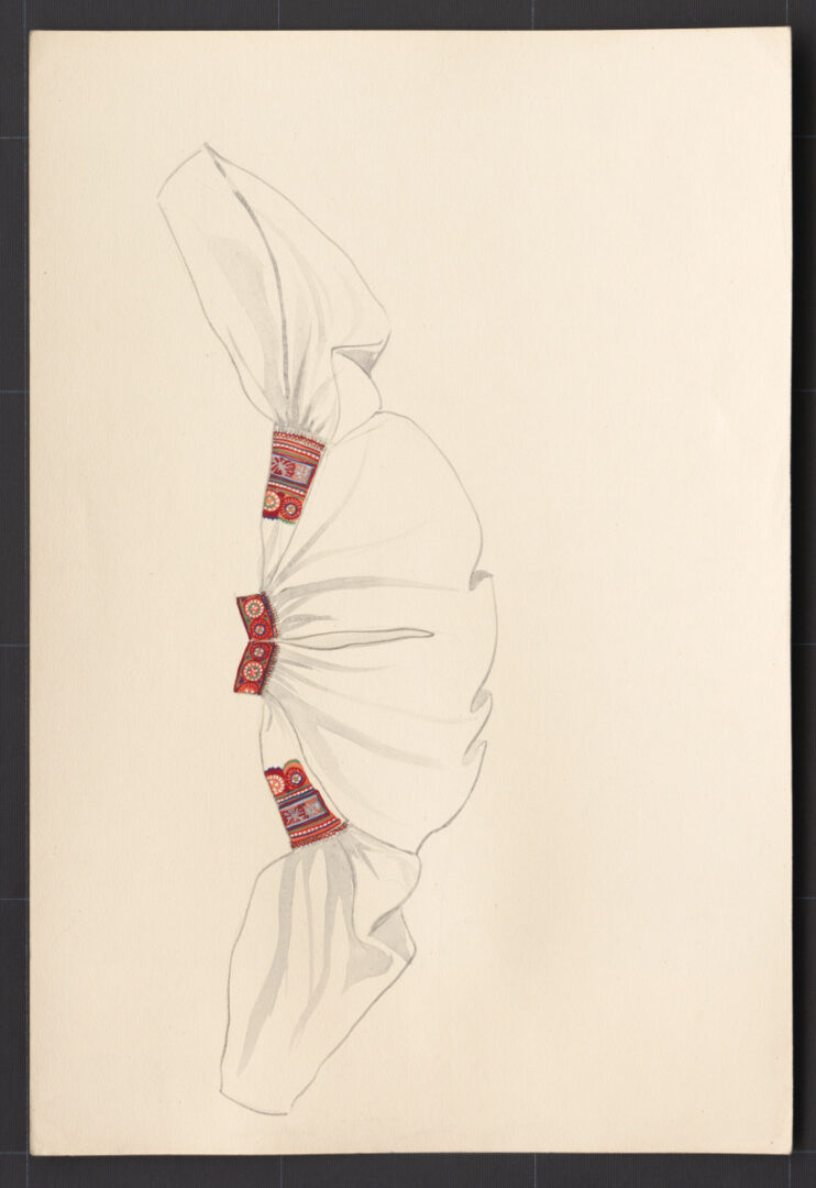 Rukávce, Lubina, začiatok 20. storočia. Rukávce sú ušité z tenkého bavlneného továrenského plátna, majú rovný strih, bokom prišité rukávy a prieramok. Výšivka na golieri a prieramku je červená, doplnená ďalšími farbami. Začiatkom 20. storočia sa už výšivka nepoužívala. Rukávy boli zošité tak, že súčasne plnili funkciu podpazušného klina. Prieramok je malý obdĺžnik plátna všitý medzi predný a zadný diel rukávcov, na ktorého spodný okraj je prišitý nazberaný horný okraj rukáva. Tým sa zmenšil horný okraj rukávcov, ktorý bolo treba nazberať a všiť do obalka alebo goliera okolo krčného otvoru. Plátenné alebo vapérové či perkálové rukávce sa nosili vo sviatočné dni. Najviac sa cenili zlatové rukávce, ktoré boli vyšívané zlatou alebo striebornou niťou cez kartón.