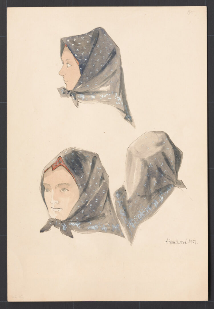 Šatka. Prvá štvrtina 20. storočia. Malé modrotlačové šatky (chustky) sa nosili najmä vo všedné dni. Ženy si ju mohli vziať aj v nedeľu popoludní. Šatka bola obojstranne potlačená, po okrajoch s bordúrou a v strede s drobným vzorom, na každej strane s iným. Veľké modrotlačové šatky sa nosili len vo sviatočné dni. V zime sa zvyčajne viazali dozadu (na zadok) a v lete dopredu (pod šiju). Aj veľká modrotlačová šatka bola obojstranne potlačená dvoma rôznymi vzormi.