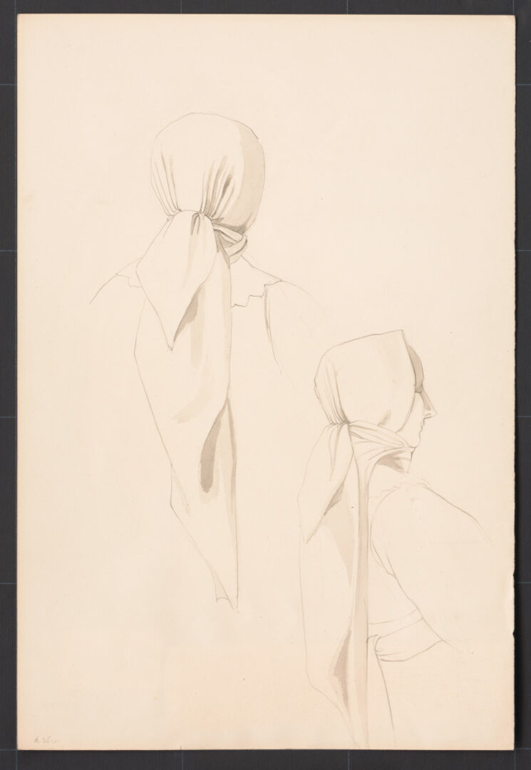 Spôsob viazania šatky, handry, z polovice 20.storočia. Takto uviazanú šatku nosili ženy vo sviatok, najmä keď išli do kostola.