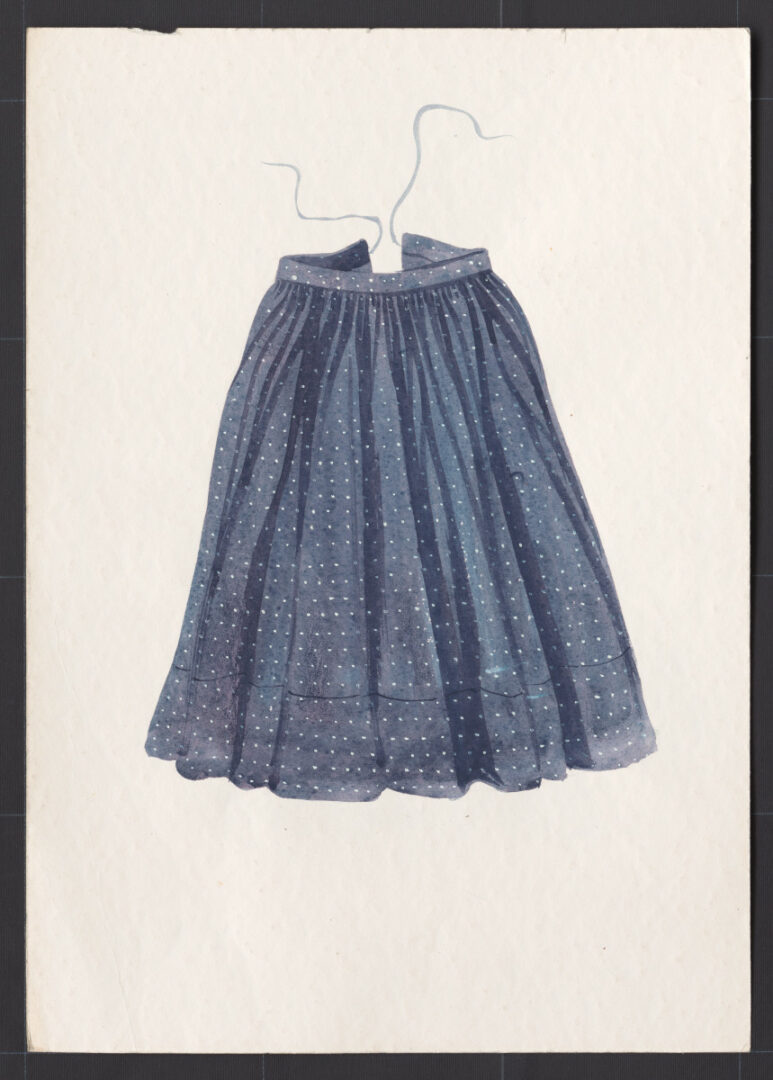 Sukňa, Skýcov, začiatok 20. storočia. Sukňa (odolok) je ušitá z piatich pôl modrotlače s drobným bielym vzorom. Nosila sa vo všedné dni. V priebehu prvej polovice 20. storočia sa začali sukne na všedné dni šiť aj z tmavého kartúnu, tiež s drobným bielym vzorom. Na sviatočné dni bola určená sukňa z kupovaného bieleho bavlneného plátna. V bielej sukni išla aj mladucha na sobáš.
