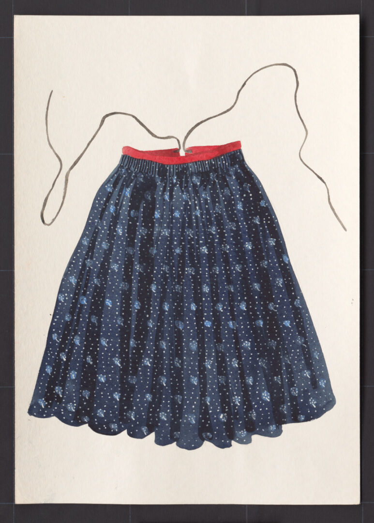 Sukňa, Spišský Štvrtok, prvá polovica 20. storočia. Sukňa (farbiarska kidľa) je ušitá z piatich pôl modrotlače na továrenskom bavlnenom plátne. Časť prednej poly je nadstavená červeným kartúnom. Pásom červeného kartúnu je tiež podšitý spodný okraj, bľach. Nové modrotlačové sukne sa nosili vo sviatočné dni, obnosené a opraté už len vo všedné dni. V prvej polovici 20. storočia sa dávalo plátno farbiť farbiarom v okolitých mestách – v Hranovnici, Spišskej Novej Vsi, Kežmarku. V druhej polovici 20. storočia sa farbiarske plátno nahradilo kupovaným kartúnom s bielymi vzormi.