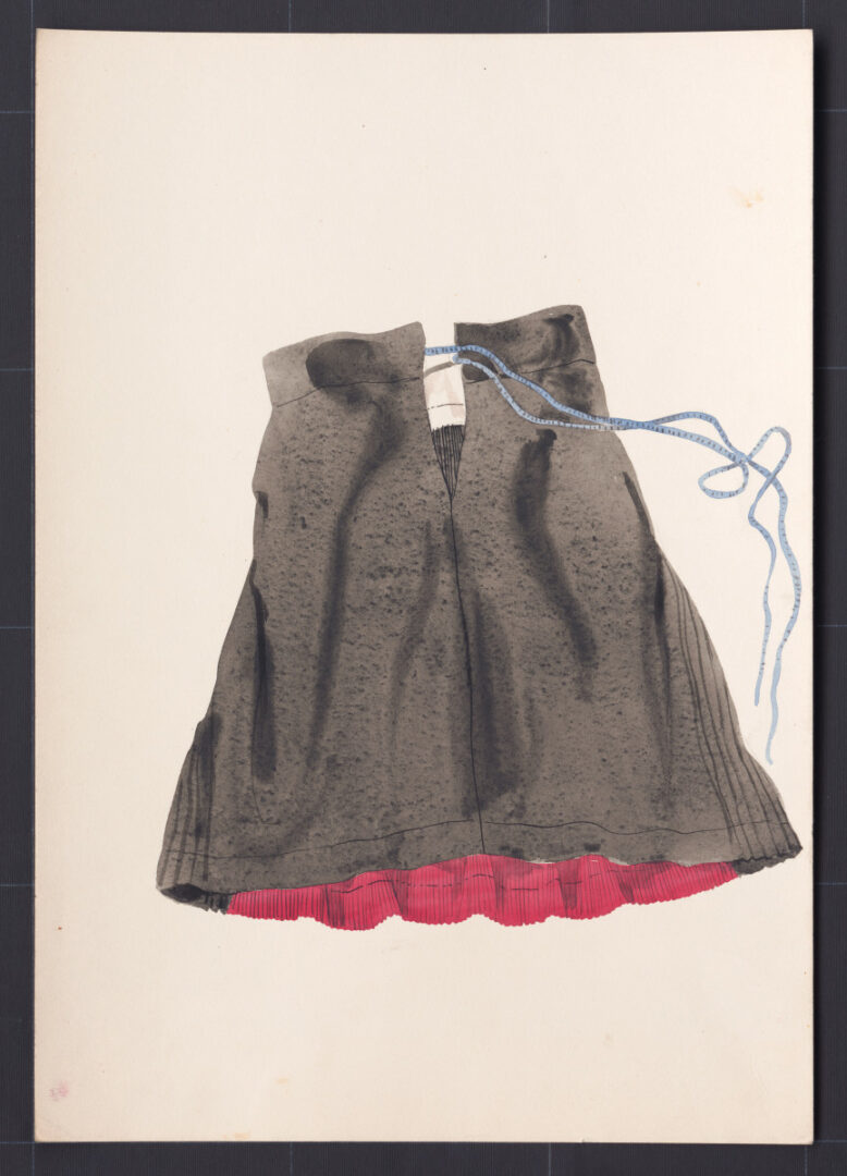 Sukňa, Opatová, začiatok 20. storočia. Sukňa (šíková sukňa) je ušitá z čierneho glotu. Po celej dĺžke je nariasená a spodný okraj má podšitý pásom červeného kartúnu. Podšitie chránilo spodný okraj pred predratím. Názov dostala od striebornej kovovej čipky (šíku), ktorú má spolu so zelenou stuhou našitú nad spodným okrajom zadnej časti. V 19. storočí sa obliekala len pri príležitosti veľkých sviatkov. Patrila aj k svadobnému odevu mladuchy. Začiatkom 20. storočia si ju obliekala už len mladucha na sobáš.