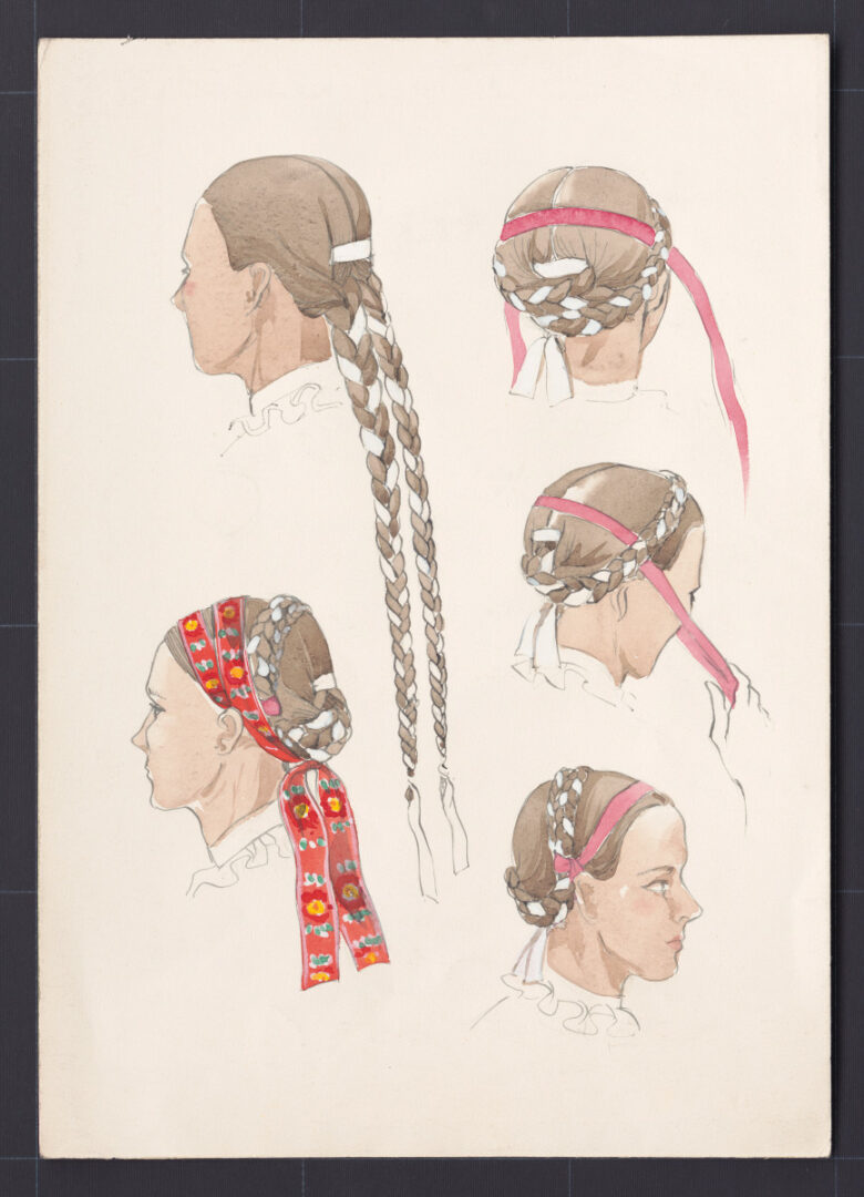 Účes slobodného dievčaťa, Omšenie, prvá štvrtina 20. storočia. Keď boli oba vrkoče zapletené, prekrížili sa na zátylku a obkrútili sa okolo hlavy. Po stranách hlavy sa pod vrkoče vložila harasová stužka (kosídlačka), preložila sa ponad čelo a uviazala sa, čím pridŕžala účes. Na záver sa okolo účesu obkrútila a uviazala brokátová stuha. Účes na zápletky nosili dievčatá vo všedné aj sviatočné dni, vo všedné dni však bez brokátovej stuhy.