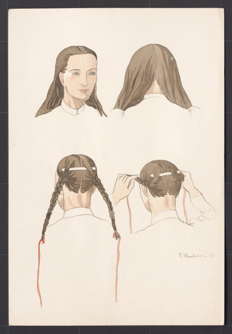Účes vydatej ženy, Hruštín, druhá štvrtina 20. storočia. Na začiatku úpravy účesu na drievko sa vlasy v strede hlavy pútcom rozdelili na dva pramene. Potom sa z každého prameňa zaplietol vrkoč. Do koncov vrkočov sa spolu s vlasmi zapletali aj šnúrky, ktorými sa účes v závere upevnil. Keď boli vrkoče upletené, do ich koreňov sa zasunula podložka do účesu (drievko), okolo ktorej sa oba vrkoče ovinuli.