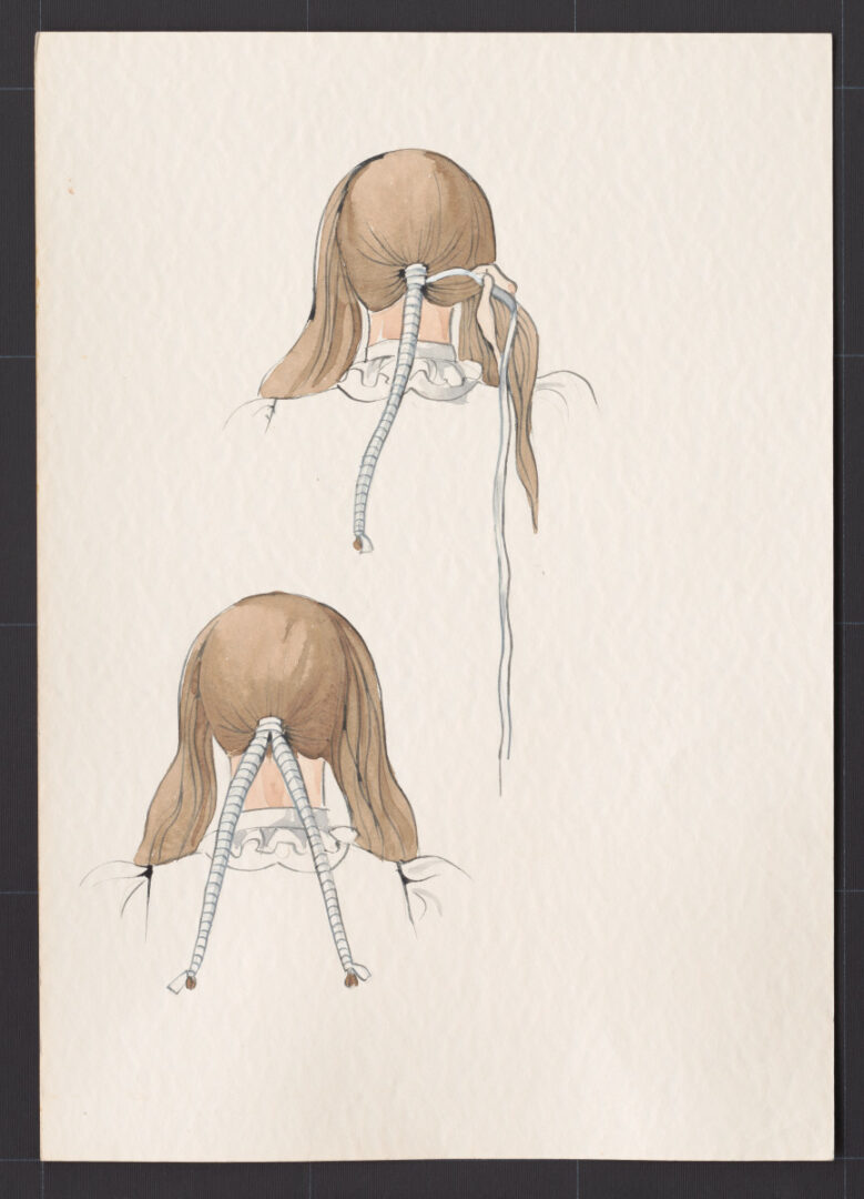 Úprava hlavy vydatej ženy, Horná Poruba, začiatok 20. storočia. Keď boli vlasy rozdelené na tri časti a tretí prameň na zátylku zviazaný, úprava účesu pokračovala rozdelením tretieho prameňa na dve časti. Každú z nich potom tuho ovinuli bielou šnúrkou, ktorou boli vlasy zviazané.