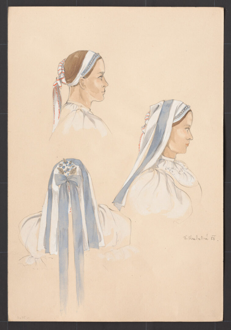 Sviatočná úprava hlavy slobodného dievčaťa, Lamač, začiatok 20. storočia. Základ úpravy tvoril účes na omotání. Ako prvá sa na hlavu založila čelenka (podrovnání) – biela stuha s úzkou modrou stužkou, na ktorej boli našité strieborné perličky z fúkaného skla. Za ňou sa na hlavu pripínali striedavo modrá a biela stuha tak, aby pokryli celý účes. Na záver sa k stužkám na zátylku upevnilo pierko z umelých kvetov (krámske péro) a uviazala sa dlhá bledomodrá hodvábna stuha. Takto upravený účes nosili dievčatá vo veľké sviatky a na slávnostné príležitosti.
