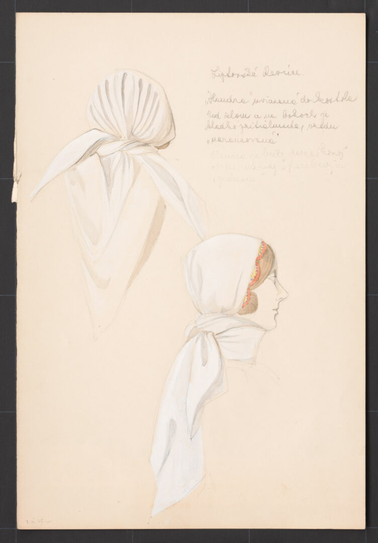 Veľká šatka na všedný deň, Liptovské Revúce, druhá štvrtina 20. storočia. Ženy si vo všedné aj sviatočné dni viazali na založený čepiec veľkú bielu šatku (handru). Na všedné dni bola určená šatka z tenkého plátna, na sviatočné dni z damašku. Šatka sa viazala okolo hlavy dozadu.