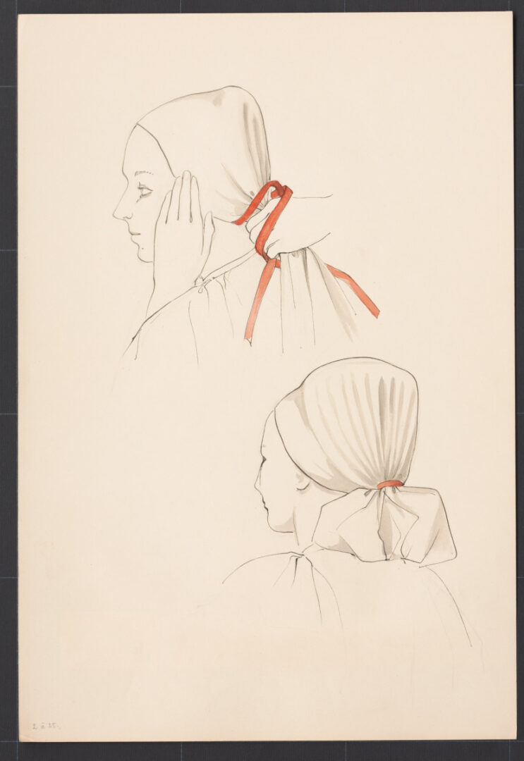 Dlhá šatka, Bzovík, prvá štvrtina 20. storočia. Vo sviatočné dni si vydaté ženy viazali na čepiec dlhú šatku, dlhý ručník. Šatka bola z úzkej dlhej poly jemného bavlneného plátna, jej konce boli zdobené čipkami a výšivkou. Musela byť taká dlhá, aby konce aj po uviazaní na čepiec viseli až po spodný okraj sukne.