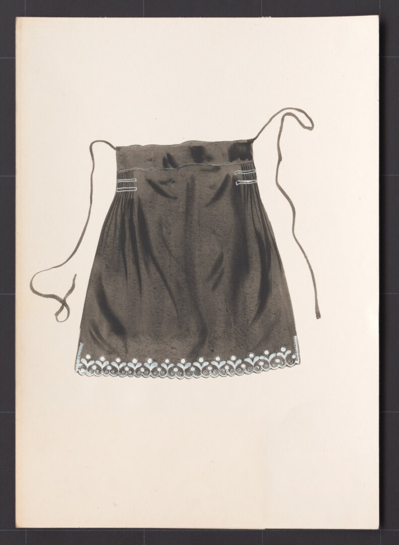 Zástera, Veľké Zálužie, začiatok 20. storočia. Zástera (kuchárka) je ušitá z jednej poly čierneho glotu a na spodnom okraji zdobená pásom bielej výšivky. Horný okraj je všitý do vysokého obalka. Zástery na všedné dni sa šili z domáceho konopného plátna zafarbeného na tmavo. Na prelome 19. a 20. storočia ženy nosili aj úzke biele zástery, ktoré boli zdobené vytkávaním a na spodnom okraji mali strapce. Zástery tkali remeselní tkáči v Hlohovci, od ktorých ich ženy kupovali. V priebehu prvej polovice 20. storočia sa začali nosiť široké zástery z troch pôl čierneho glotu, ktoré boli zdobené buď strojovou výšivkou, alebo našitými stuhami.