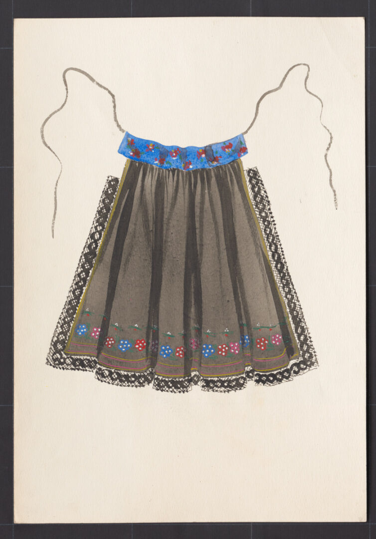 Sviatočná zástera, Poniky, začiatok 20. storočia. Zástera (šata) je ušitá z dvoch pôl čierneho glotu. Naberaný horný okraj zástery je všitý do obalka z modrého kašmíru. Nad spodným okrajom je pás strojovej výšivky. Výšivka na zástere dokladá, že bola určená pre mladú ženu. Staršie ženy mali zásteru bez výšivky. Vo všedné dni sa nosila úzka zástera (fjertuška), ktorá bola z jednej poly domáceho konopného alebo ľanového plátna, zafarbeného na tmavo. Mohla byť aj z modrotlače s bielou alebo zelenou bordúrou dookola.