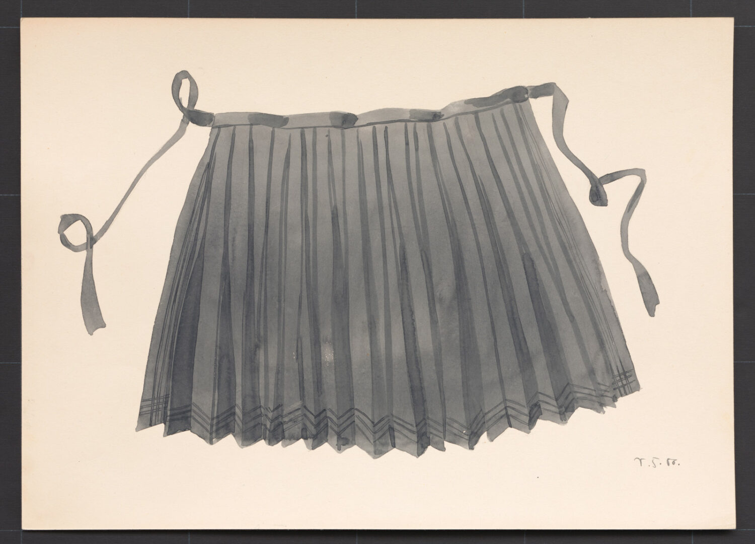 Ženská zástera, Skačany, prvá štvrtina 20. storočia. Zástera je ušitá z dvoch pôl čierneho lacnejšieho bavlneného plátna. Okraje zdobia pásy čierneho strojového štepovania. Zástera tvorila súčasť všedného odevu. Ak bola nová, mohla si ju staršia žena zobrať aj vo sviatočný deň. Zástery na všedné dni sa pôvodne šili z domáceho na tmavo zafarbeného konopného plátna, až začiatkom 20. storočia sa začali šiť aj z lacnejšieho kupovaného bavlneného plátna. Sviatočné zástery sa šili z čierneho perkálu, glotu alebo listra – z materiálov, ktoré mali lesklý povrch.