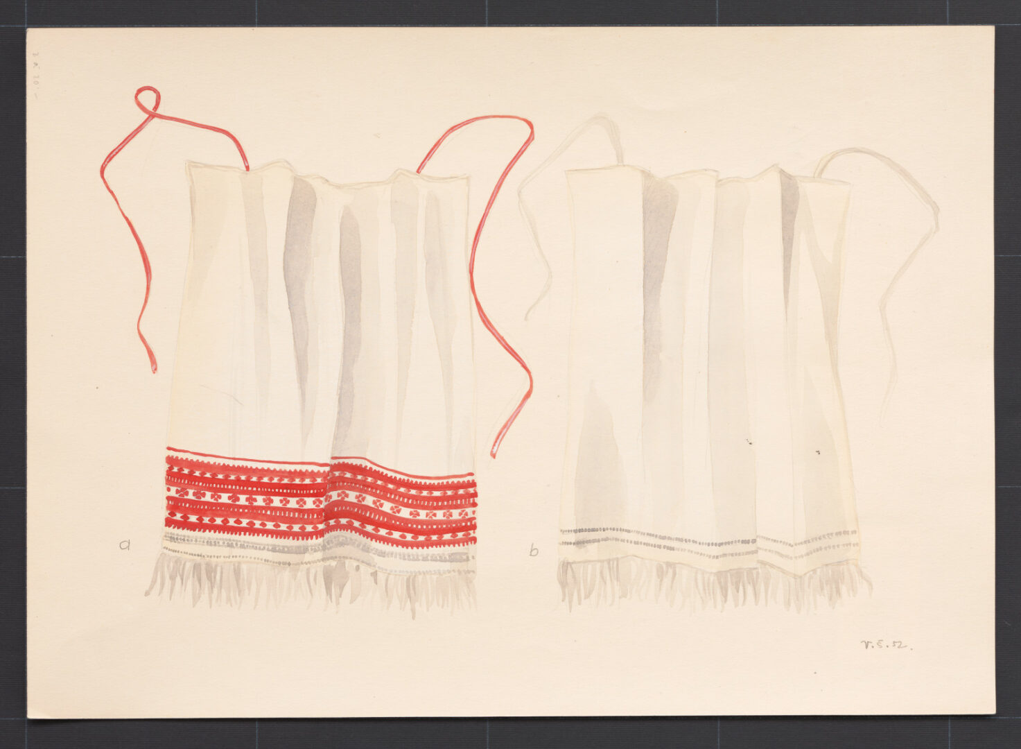 Ženské zástery, Turie Pole, prvá polovica 20. storočia. Obe zástery sú ušité z jednej poly domáceho ľanového plátna. Nosili sa vo všedné dni. Zástera s pásom červeného vytkania nad spodným okrajom sa opásavala pri pobyte mimo domu. Zástera bez zdobenia sa nosila pri práci v dome a okolo domu.