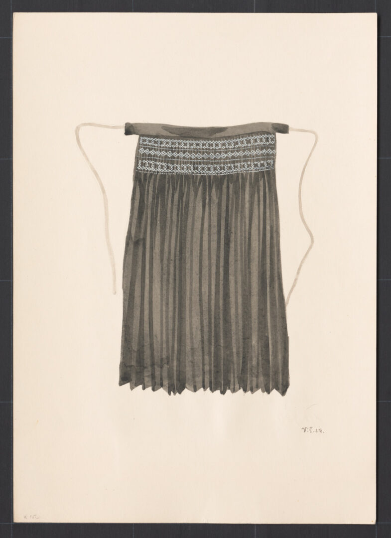 Ženská zástera, Turie Pole, prvá štvrtina 20. storočia. Zástera (šata) je ušitá z dvoch pôl čierneho glotu – hatlasu. Po celej dĺžke je nabratá a všitá do úzkeho obalka. Sklady v páse zdobí biela výšivka. Zástera bola súčasťou sviatočného odevu. Pred zásterou z glotu sa v 19. storočí a začiatkom 20. storočia nosila široká zástera z modrotlače s veľkým bielym alebo žltým vzorom.