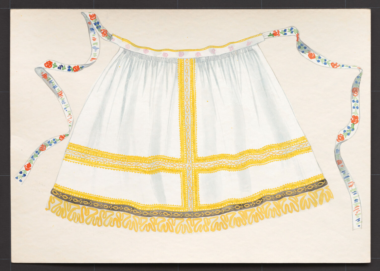 Zástera, Chorvátsky Grob, začiatok 20. storočia. Zástera (vapérový podolkový fertuch) je ušitá z dvoch pôl bieleho vapéru – jemnej bavlnenej látky. Podolkami sa nazývali kratšie časti oboch pôl. Poly a podolky sú spojené žltou paličkovanou mriežkou, lemovanou žltou výšivkou. Na spodnom okraji je našitá paličkovaná pásiková čipka. Bielu širokú zásteru nosili slobodné dievčatá a mladé ženy na veľké sviatočné príležitosti k ťažkej sukni. Opásanú ju mala aj mladucha na sobáši. Staršia žena si ju zobrala len vtedy, keď niesla ako kmotra dieťa na krst alebo keď išla ako krstná matka svojmu krstnému dieťaťu na sobáš.
