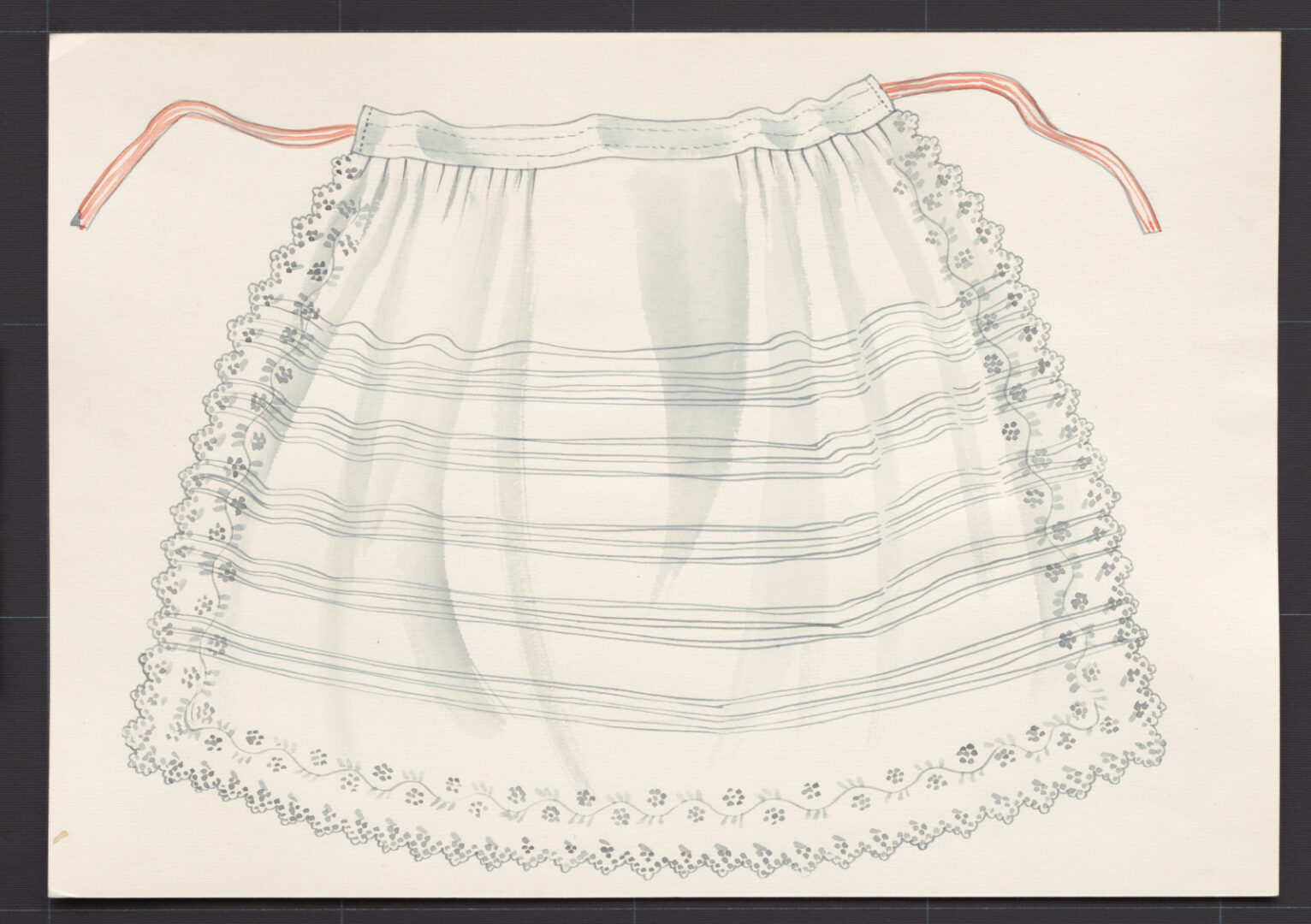 Zástera, Studienka, prvá štvrtina 20. storočia. Zástera (fjertoch) je ušitá zo širokej poly bieleho jemného batistu. Po celej ploche ju zdobia rady drobných zámikov. Po obvode je vyšitá bielou dierkovou výšivkou, ktorú mohla nahradiť biela čipka. Biela široká zástera tvorila súčasť svadobného odevu mladuchy. Mladé ženy ju nosili aj na veľké sviatky. V pôstnom období a v čase smútku nosili ženy čierne alebo modré široké zástery, ušité z dvoch pôl plátna alebo kašmíru. Čierne zástery zdobila zelená a modré žltooranžová výšivka.