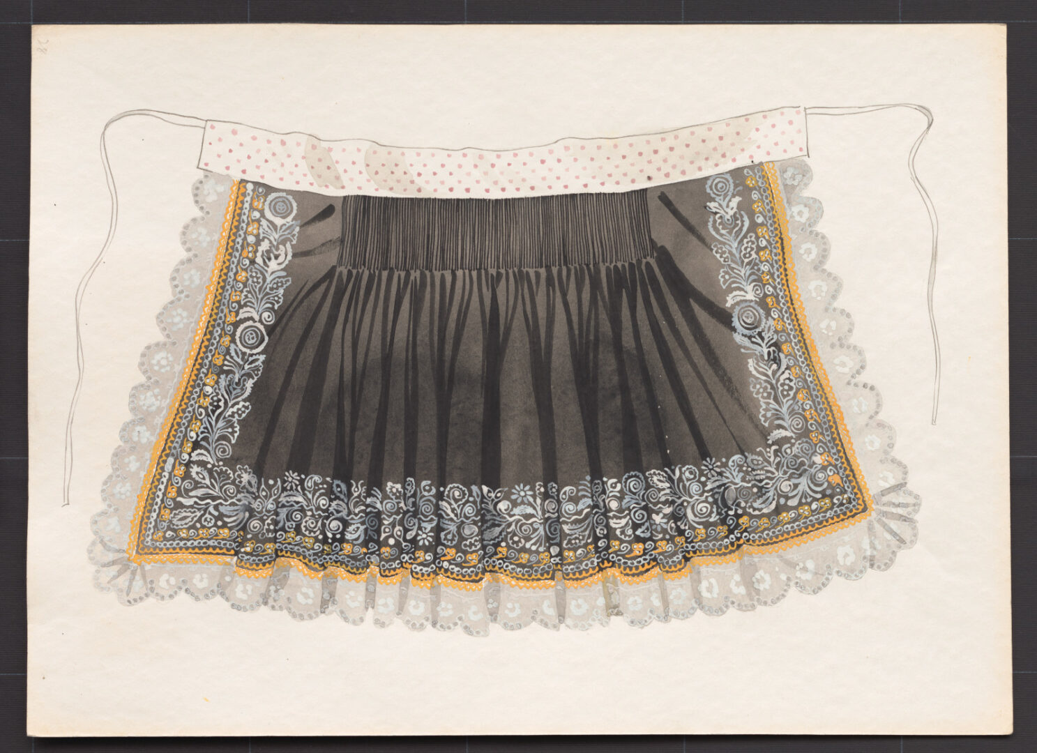 Predná zástera, Krakovany, prvá štvrtina 20. storočia. Zástera je ušitá z dvoch pôl čierneho glotu. Pozdĺž troch okrajov ju zdobí širší pás bielej a užšie pásiky bielej a oranžovej výšivky. Pás bielej výšivky sa nazýva parta. Pôvodne sa na týchto zásterách vyšíval užší pás výšivky (haluz), ktorej stredom išla vlnovka. Na okrajoch je ešte našitý pás bielej čipky. Zástera patrila k odevným súčiastkam sviatočného odevu, konkrétne pre slobodné dievča alebo mladú ženu. Poukazuje na to šírka čipky dookola zástery. Staršie ženy mali čipku úzku. K prednej zástere patrila zadná zástera z rovnakého materiálu a s rovnakou výzdobou.