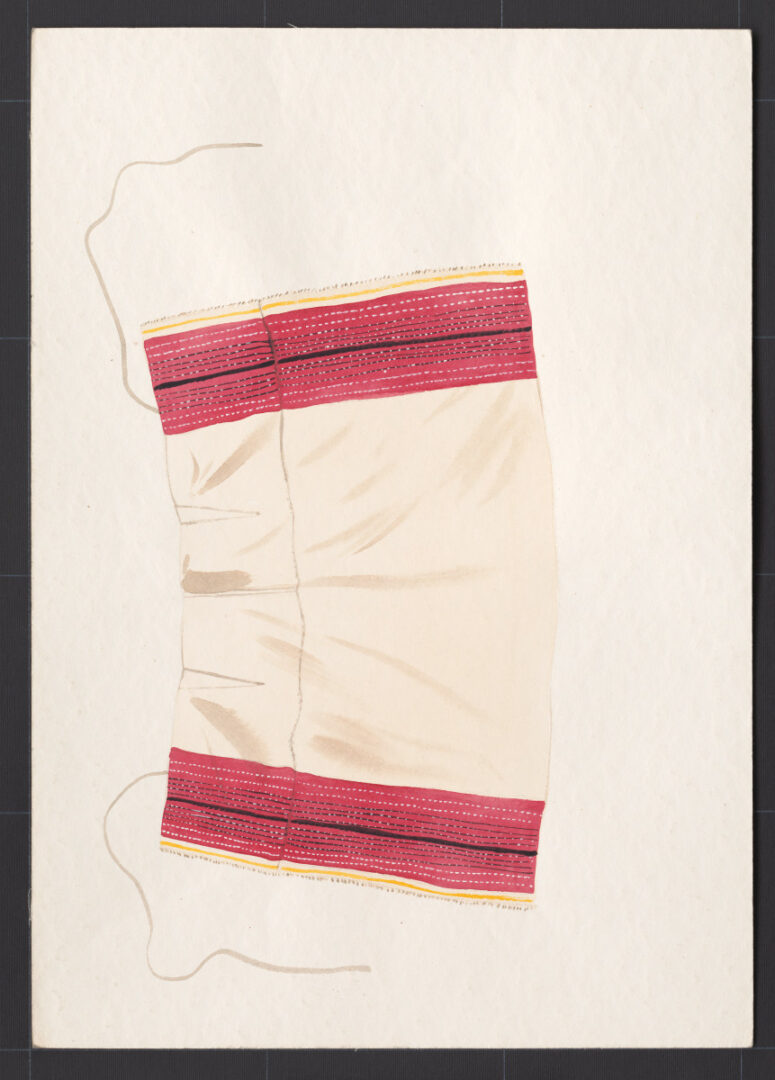 Zástera, Skýcov, koniec 19. storočia. Zástera (dupel) je ušitá z pol druha priečne zošitej poly domáceho konopného plátna. Široké pruhy po jej stranách sú vytkané červenou bavlnou. Zástera predstavuje starobylú odevnú súčiastku. Obliekala sa priamo na rubáš, a to tak, že sa naň opásala spredu. Na ňu sa opásala ďalšia, užšia čierna glotová zástera tak, aby odstávujúce červeno vytkávané boky dupla bolo vidno. Zozadu sa na rubáš opásala tretia, úzka čierna glotová zástera. Popri odeve s tromi zásterami sa súčasne nosil odev s bielou konopnou sukňou (odolkom), po celej dĺžke riasenou. Začiatkom 20. storočia nosenie oboch foriem zaniklo.