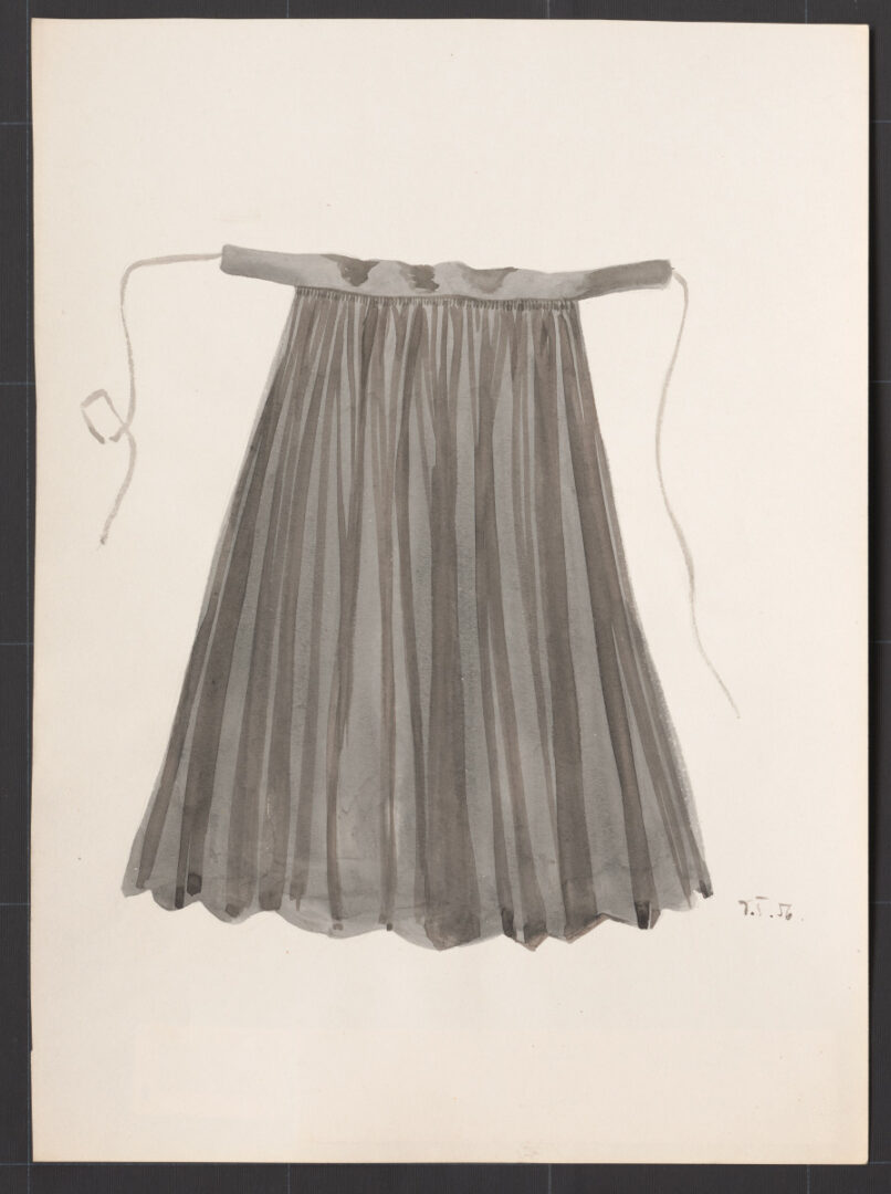 Sviatočná zástera, Lazisko, začiatok 20. storočia. Zástera (šata) je ušitá z dvoch pôl veľmi tenkého bavlneného plátna – mušelínu. Okrem čiernej farby mohli byť zástery aj svetlejšie alebo tmavšie modré. Zástera na všedné dni sa šila z jednej poly domáceho konopného alebo ľanového plátna, ktoré sa dalo farbiarovi zafarbiť na tmavomodro.
