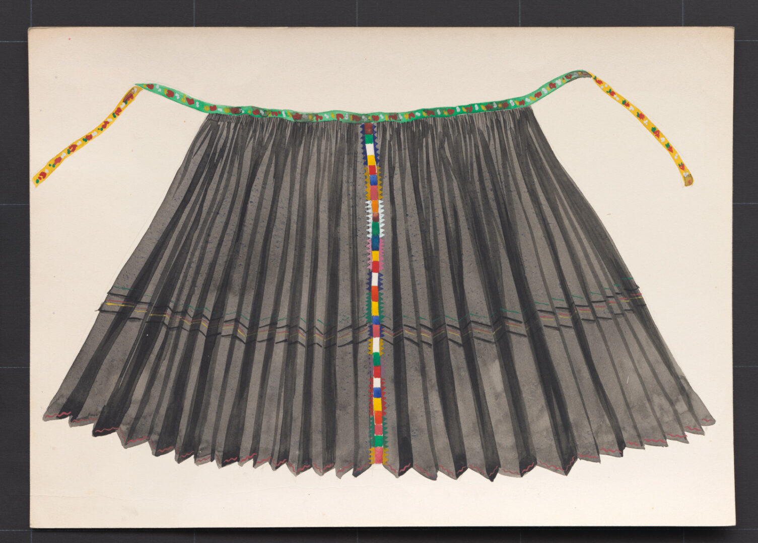 Široká zástera, Šarišské Sokolovce, začiatok 20. storočia. Široká zástera (fartuch) je ušitá z dvoch širokých pôl tmavého a lesklého, plamenného modrotlačiarskeho plátna. Poly sú zošité pestrofarebnými plochými stehmi. Horný okraj zástere je drobno naberaný a všitý medzi dve ozdobné stuhy, ktoré nahrádzajú úzky obalok sukne. Široká zástera bola súčasťou sviatočného odevu žien.