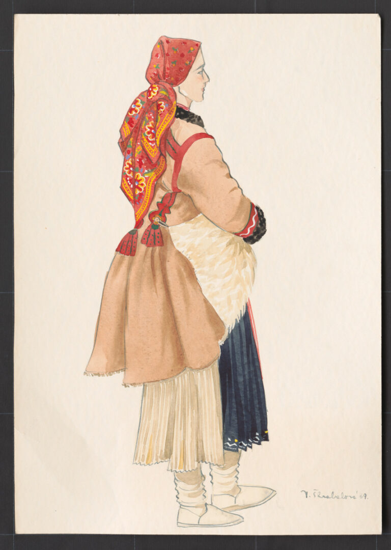 Sviatočný odev ženy v zimnom období, Kubrá, koniec 19. storočia. Žena má na základnom odeve, ktorý sa skladá z rubáša, rukávcov, zo sukne so živôtikom a zo širokej zástery, dlhý kožuch. Pod kožuch sa vždy obliekali staršie, obnosené odevné súčiastky, najmä rukávce, aby sa neošúchali. Na hlave má žena uviazanú veľkú kartúnovú šatku s pestrofarebnou olejovou potlačou, kožmanický ručník. Šatku má uviazanú priamo na účese, na ktorom nemá založený čepiec. Už koncom 19. storočia ženy v obci nosili čepce len výnimočne. Žena má obuté vlnené (mrežuvané) papuče s vysokou pletenou sárou.