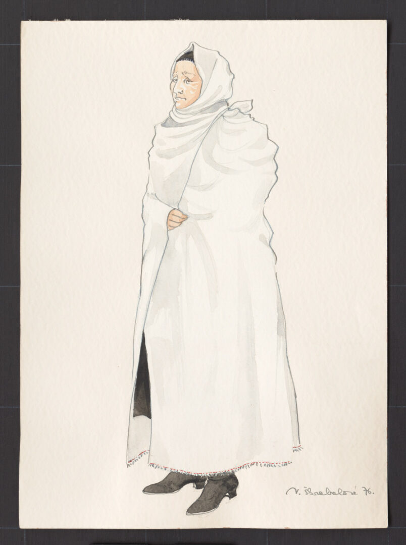 Vrchný odev ženy do chladného počasia, Dubodiel, koniec 19. storočia. Žena má cez základný odev prehodenú odevnú plachu. Plachta je z dvoch pôl damašku, zošitých žltou konopnou niťou. Ženy sa plachtou zahaľovali tak, že stred užšej strany si položili na hlavu, pričom kúsok plachty zahli, oba rožky pod hrdlom prekrížili a vzadu uviazali. Dlhé strany plachty vpredu preložili cez seba a rukou si ich pridŕžali pri sebe. Žena bola zahalená v plachte celá, bolo jej vidno len tvár. Takto zahalené chodili ženy v 19. storočí v chladnom období iba do kostola.