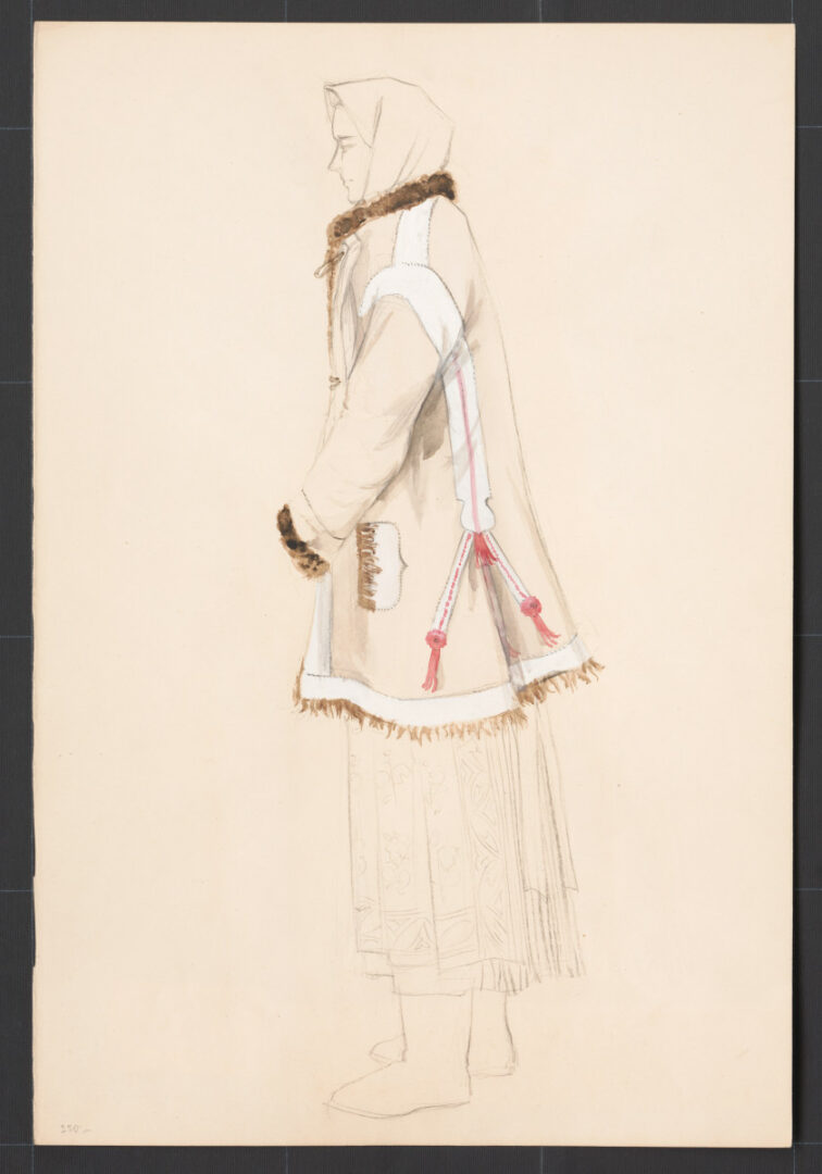 Vrchný odev ženy v zimnom období, Liptovská Lúžna, koniec 19. storočia. Žena má na základnom odeve, ktorý pozostáva z plátenných rukávcov (oplecka), zo spodnej sukne zo štyroch kosých pôl plátna, z vrchnej sukne so živôtikom (sukne s kabotkom) a z modrotlačovej zástery (šaty), oblečený dlhý kožuch z bielej ovčej kožušiny. Kožuch lemuje pás čiernej ovčej barančiny a zdobia ho pásy bielej irchy. Koncom 19. storočia boli kožuchy zdobené len veľmi striedmo. Začiatkom 20. storočia sa ich výzdoba rozšírila o prvky z červenej irchy. V priebehu prvej štvrtiny 20. storočia nosenie bielych kožuchov zaniklo. Nahradili ich hnedé (červené) kožuchy.