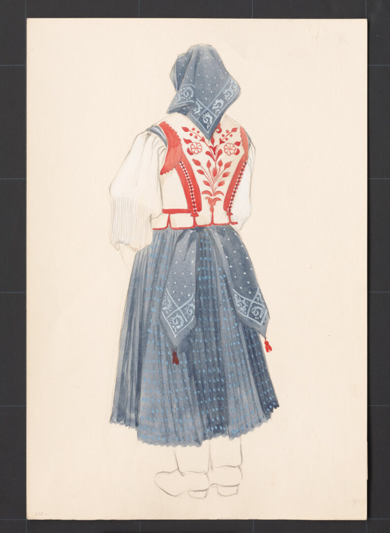 Sviatočný odev ženy. Pohľad zozadu. Prvá štvrtina 20. storočia. Žena má oblečené rukávce (oplecko) a rubáš (pentlík) – oboje z domáceho bavlneného plátna, ďalej kožuštek (kožušanku), vrchnú sukňu (kidľu) z modrotlače a širokú zásteru (fartuch) z tmavého farbiarskeho plátna. Pod kožuštekom má cez plecia a krížom cez hruď uviazanú veľkú modrotlačovú šatku (šatku na šiju). Takto oblečené bývali ženy vo sviatočné dni, najmä v zime pri návšteve kostola. K úplnosti zimného oblečenia ešte chýba plyšový ženský kabátik (vizitka), ktorý by mala žena oblečený na kožušteku.