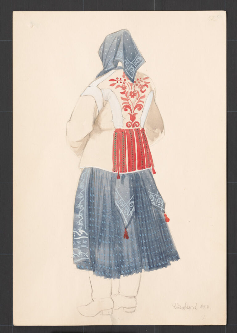 Sviatočný odev ženy. Pohľad zozadu. Prvá štvrtina 20. storočia. Žena má oblečené rukávce (oplecko) a rubáš (pentlík) – oboje z domáceho bavlneného plátna, ďalej vrchnú sukňu (kidľu) z modrotlače, širokú zásteru (fartuch) z tmavého farbiarskeho plátna a kožuch s rukávmi. Pod kožuchom má cez plecia a krížom cez hruď uviazanú veľkú modrotlačovú šatku (šatku na šiju), ktorej konce visia vzadu dolu sukňou. Takto oblečené bývali len bohaté ženy vo sviatočné dni, najmä pri návšteve kostola v zimnom období, keďže kožuch patril k nákladným odevným súčiastkam. Ostatné ženy nosili v zime kožušteky a na nich plyšové kabátiky.