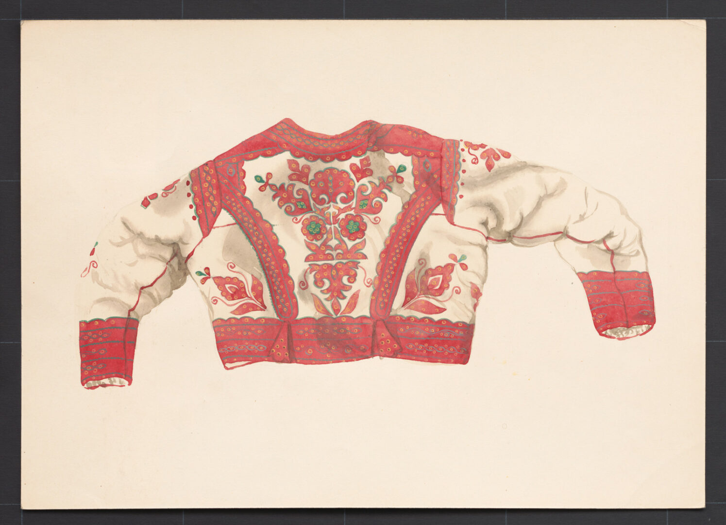 Kožuch pre mladú ženu, Ábelová, okolo roku 1910. Kožuch je ušitý z bielej ovčej kožušiny. Okraje kožucha, rukávov a švíky sú zdobené širokým pásom červenej irchy, ktorá je doplnená zeleným sirmovaním a drobnými kovovými krúžkami. Výzdobu zadného dielu tvorí veľká kytica z ornamentálnych motívov, aplikovaná z červenej a zo zelenej irchy, ktorá je doplnená drobnými magočkami. Kožuchy starých žien mali výzdobu z bielej irchy.
