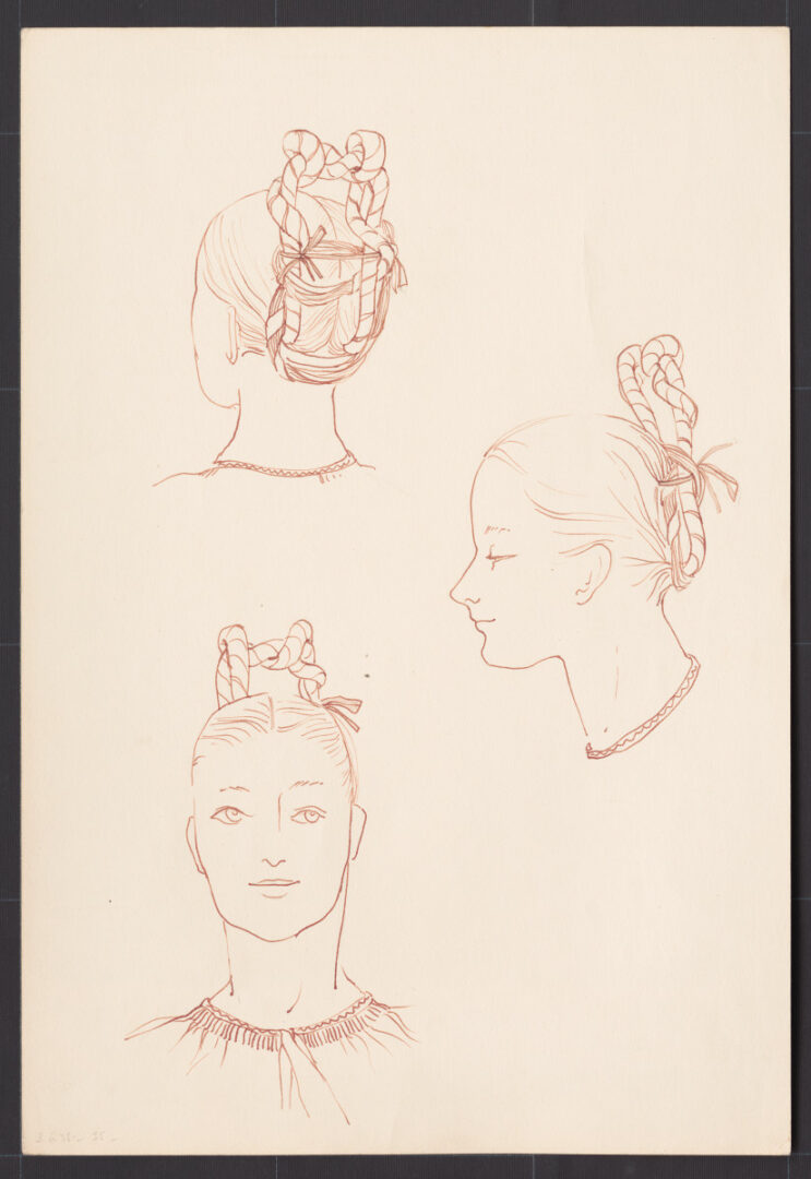 Kresba postupu česania ženského účesu, na chomľu, z 1.polovice 20.storočia.