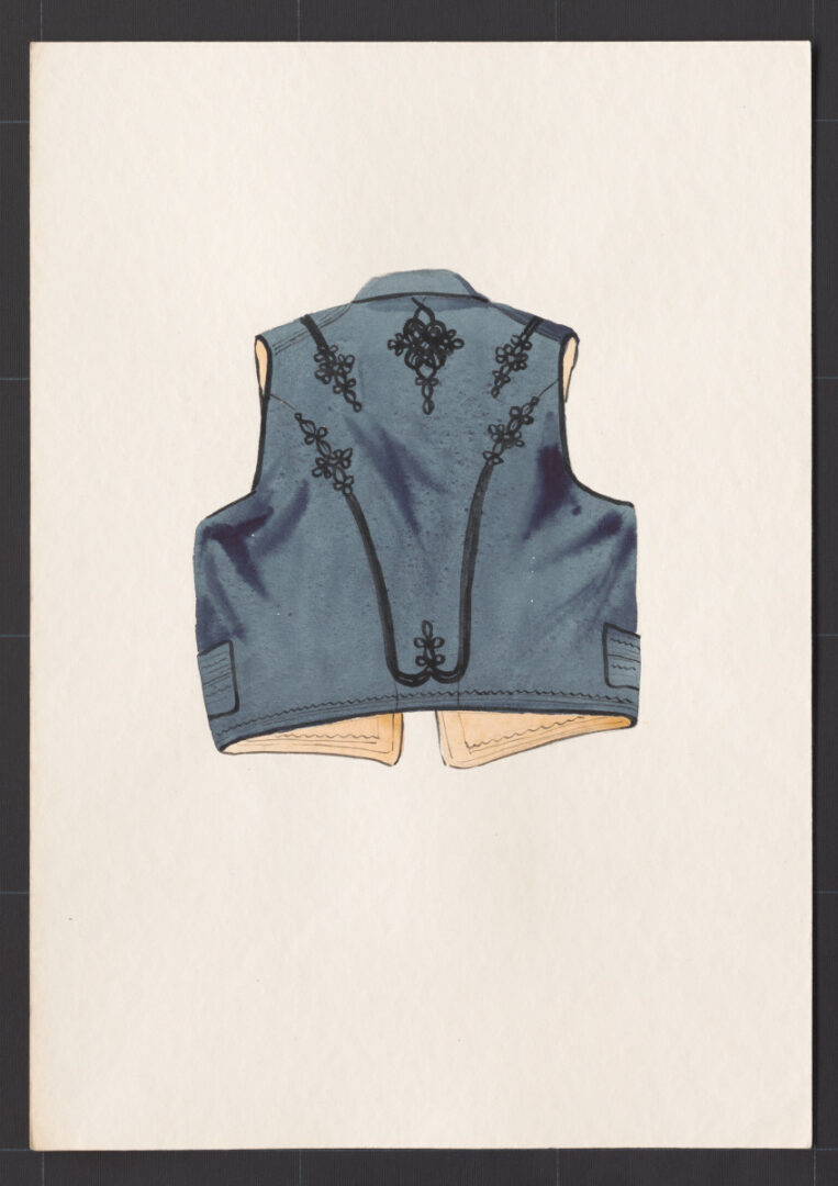 Lajblík, Veľký Blh, koniec 19. storočia. Lajblík je ušitý z jemného tmavomodrého súkna a podšitý bielym barchetom. Strihaný je do pása. Okolo krčného výstrihu má úzky preložený golier. Predné diely, švíky a okraje lajblíka zdobí šnurovanie z čiernych vlnených šnúr. Dopĺňa ho strojové štepovanie a rad malých kovových gombíkov. Časť gombíkov slúžila na zapínanie a časť iba na výzdobu. Lajblíky sa šili aj z čierneho súkna. Nový lajblík tvoril súčasť sviatočného odevu mužov. Starší, obnosený sa nosil už len vo všedné dni.